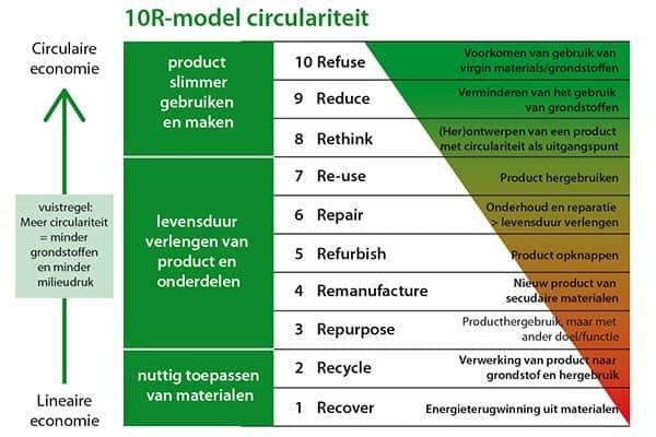 In dit project werken we volgens het 10R-model circulariteit (zie onder). Door te meten wat de redenen zijn van retouren proberen we met inzet van slimme data en AI de oorzaken te bepalen en op basis van deze data verspilling te voorkomen (dus inzamelen – reuse – meten en refuse: iets wat je niet nodig hebt moet je niet maken).